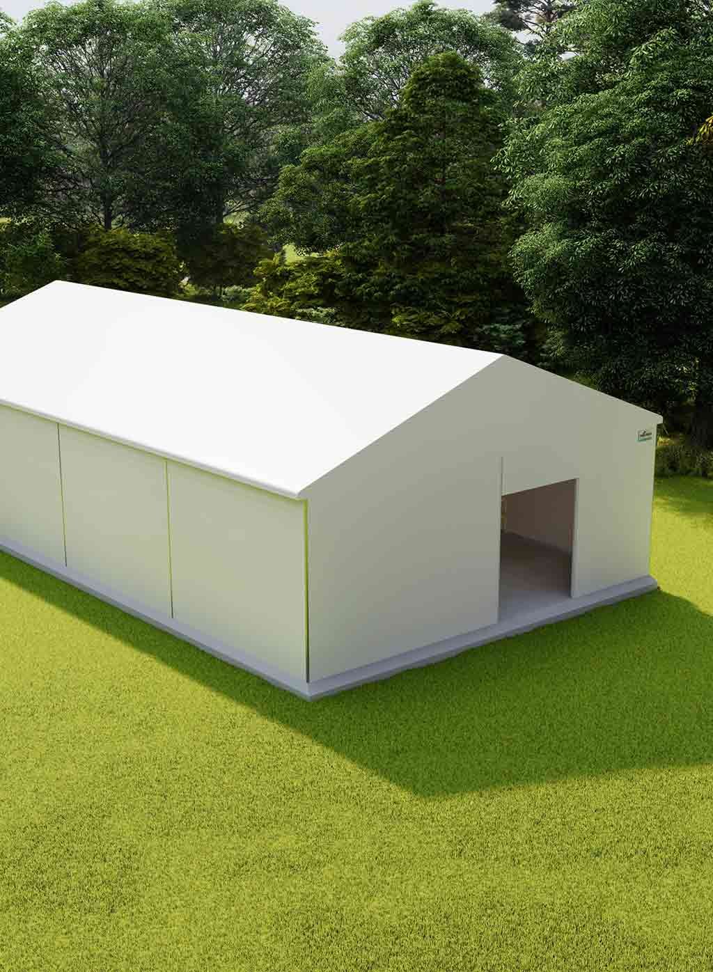 O Galpão de Lona Duas Águas da Tópico possui estrutura metálica galvanizada a fogo e acabamento em perfil de alumínio, além disso tem durabilidade de até 40 anos. Ele conta com uma cobertura em lona vinílica, que garante a impermeabilidade contra agentes externos, como chuvas e umidade.